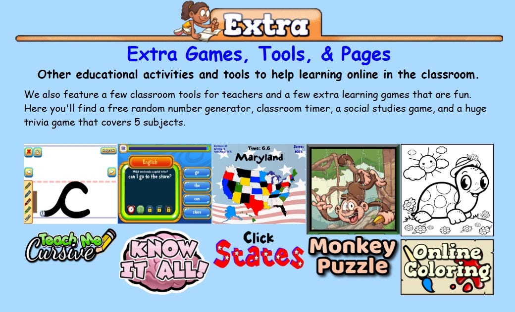 Extras: A classroom timer, trivia challenges, and even themed game pages